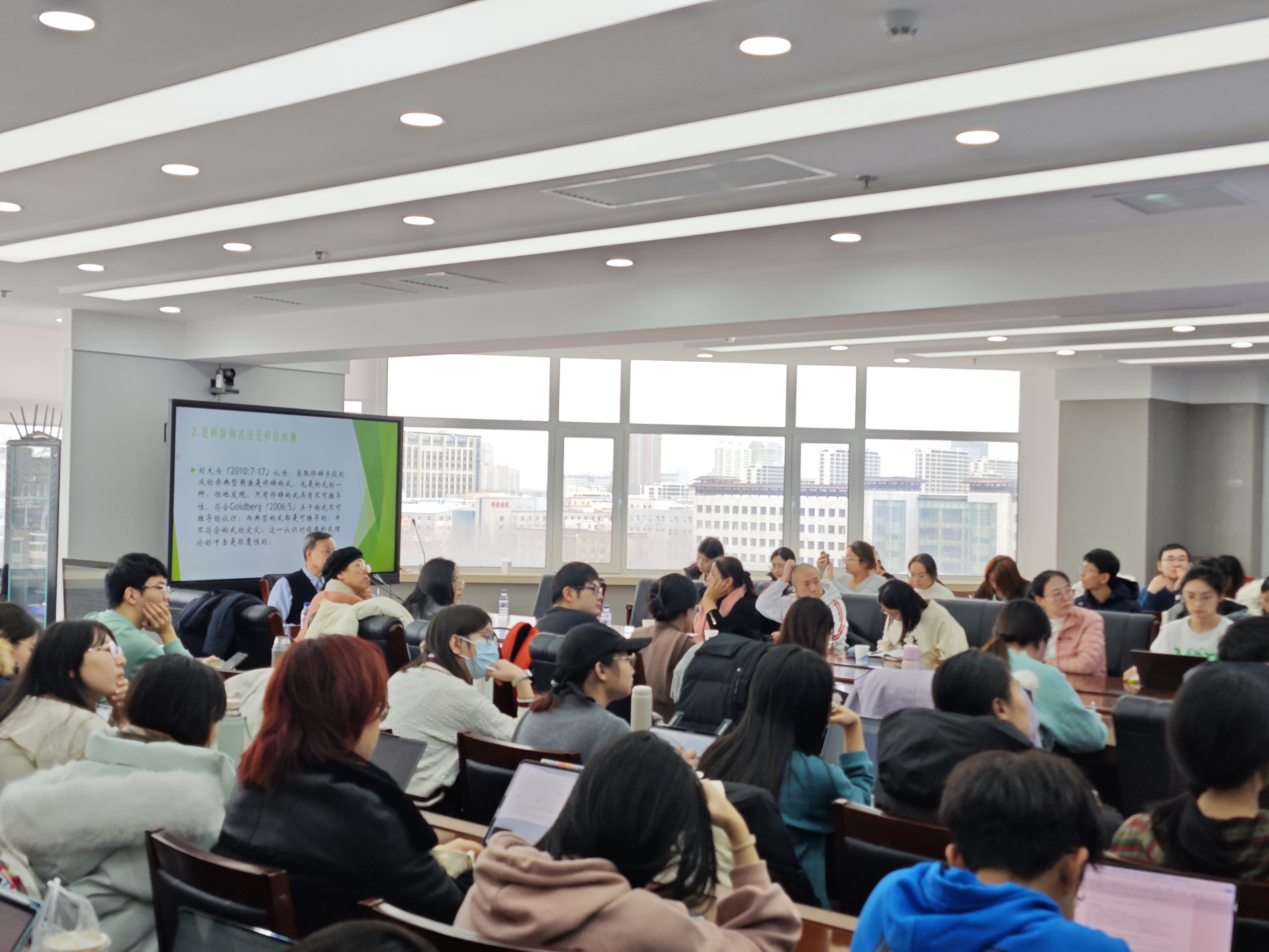 在讲座的主体部分,吴长安教授详细描摹了汉语构式从单音节时代到现今的发展路径,通过丰富的历史例证和生动的语言描述,展现了汉语构式演变的复杂性和多样性。他特别强调了“‘待’与‘嵌’”、“分析式与综合式”等多个方面,深入剖析了汉语构式发展所呈现出的独特特点,让与会师生对汉语构式的认识更加全面和深入。此外,吴教授还着重论证了汉语构式中的变异问题,通过对比分析不同语境、不同历史时期的构式变化,揭示了汉语构式演变的内在规律和动力。