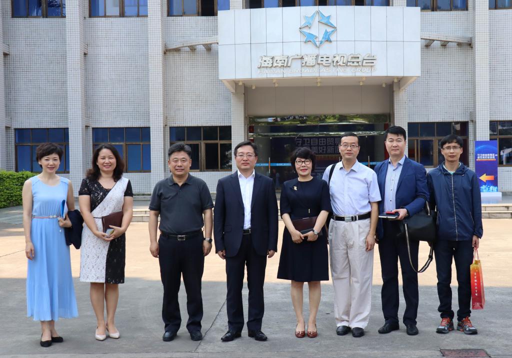 图1:海南广播电视总台台长、党委书记,海南广播电影电视传媒集团有限公司董事长孔德明(左三)、总编辑尹婕妤(右四)迎候在海南广播电视总台大楼门口,亲切接见了康永刚书记(左四)一行,并合影留念。