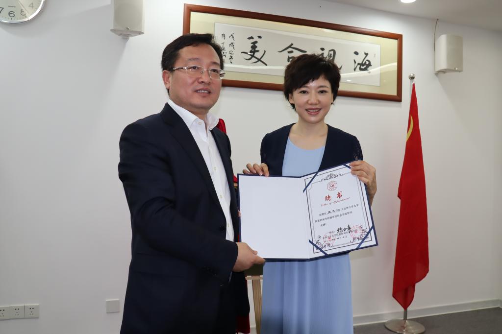 图5:康永刚书记(左)向海南广播电视总台专家王乙艳(右)颁发社会实践导师聘书。