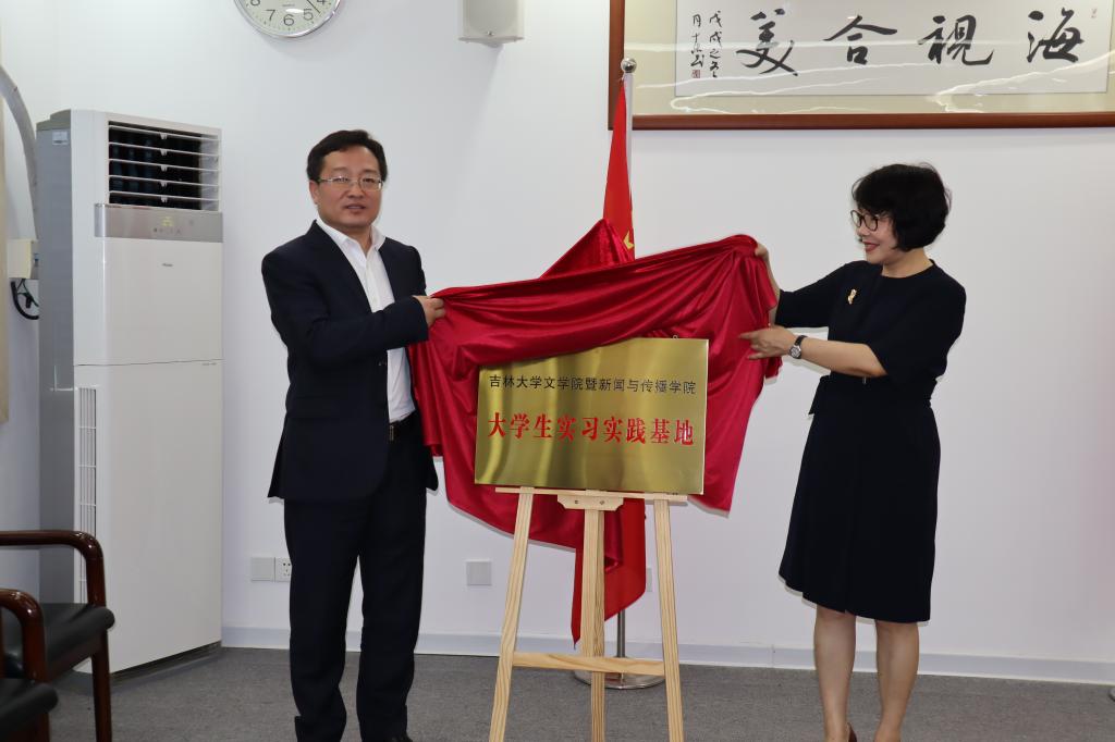 图2:爱体育(中国)党委书记康永刚(左)、海南广播电视总台总编辑尹婕妤(右)共同为“大学生实习实践基地”揭牌。