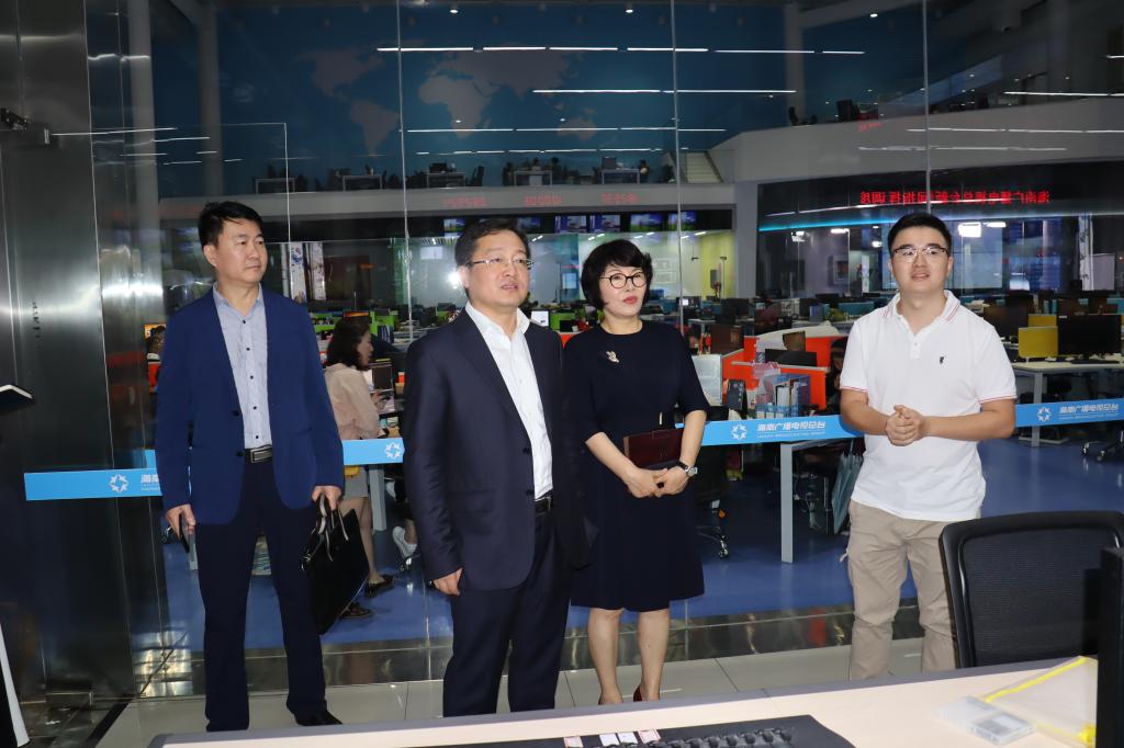 图6:海南广播电视总台总编辑尹婕妤(右二)陪同康永刚书记(左二)一行参观海南广播电视总台。