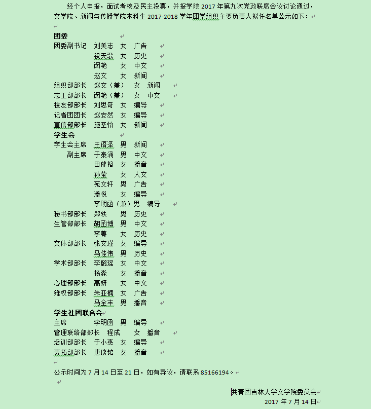 爱体育(中国)、新闻与传播学院2017-2018学年本科生团学组织主要负责人拟任名单公示